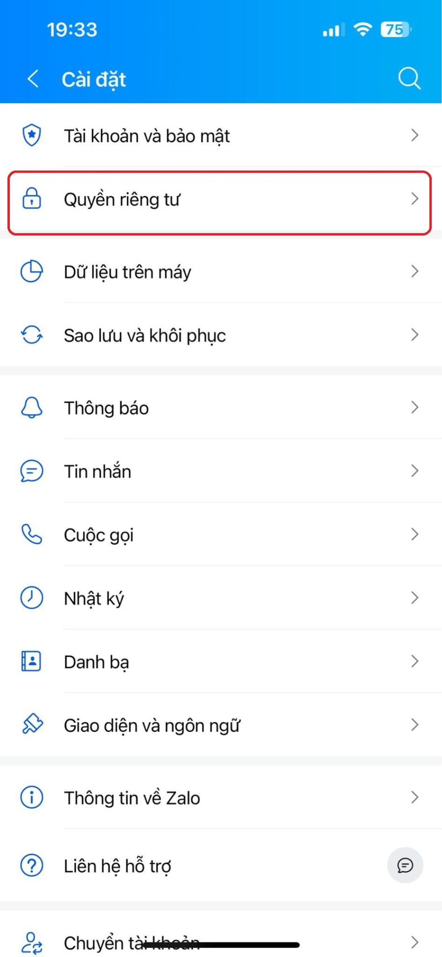 Bước 1: Kích hoạt ứng dụng Zalo trên smartphone, nhấn vào biểu tượng "Cá nhân" ở góc bên phải, sau đó nhấn chọn "Quyền riêng tư" từ menu hiện ra.