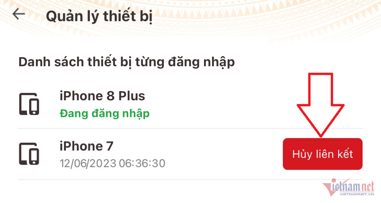 Bước 3: Tại đây, sẽ có danh sách các thiết bị đã từng đăng nhập tài khoản VNeID trước đó. Bạn cần hủy liên kết trên điện thoại cũ hoặc các thiết bị lạ, bằng cách nhấn vào mục “Hủy liên kết” bên cạnh thiết bị cũ.