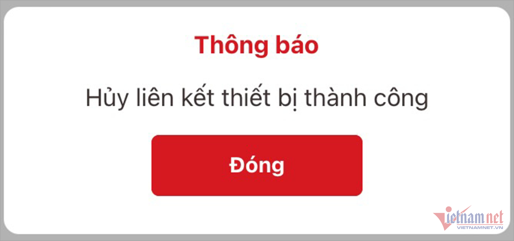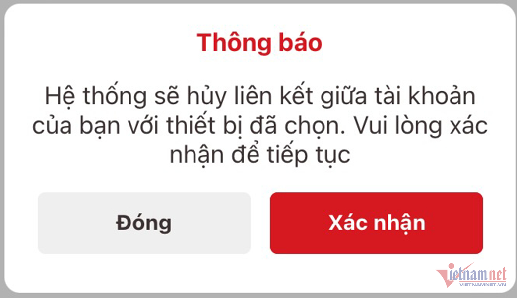 Bước 4: Hệ thống sẽ hiển thị thông báo hủy liên kết giữa tài khoản của bạn với thiết bị đã chọn. Bạn bấm “Xác nhận” để việc hủy liên kết hoàn tất.