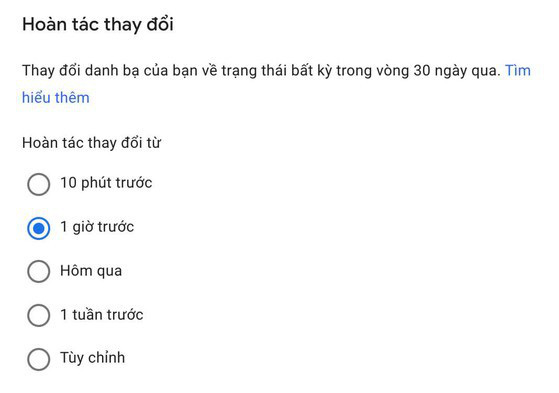 Trong cửa sổ mới hiện ra, bạn có thể đưa danh bạ trở về trạng thái trước đó, đơn cử như trong vòng 10 phút trước, một giờ trước, hôm qua, một tuần trước hoặc Custom (tùy chỉnh thời gian bất kỳ).