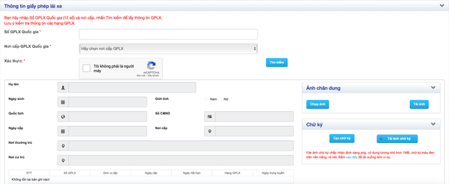 - Bước 2: Trong trang mới hiện ra, người dùng chỉ cần nhập số GPLX vào khung trống, chọn nơi cấp và đánh dấu vào ô Tôi không phải là người máy rồi nhấn Tìm kiếm. Khi hoàn tất, mọi thông tin cá nhân sẽ hiển thị ở ngay bên dưới. Nếu không tìm ra thông tin nghĩa là bạn không thể đăng ký đổi GPLX qua mạng.