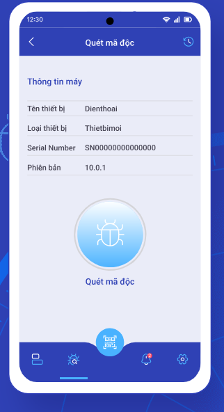 Nhấn vào biểu tượng "Quét mã độc" ở menu phía dưới, sau đó nhấn vào biểu tượng con bọ tại giao diện hiện ra.