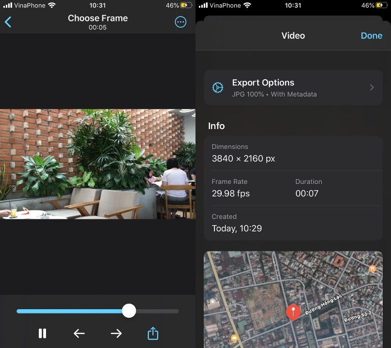 Ảnh kết quả sẽ được lưu vào thư viện ảnh và nó sẽ có độ phân giải bằng với độ phân giải của video gốc. Bạn có thể kiểm tra độ phân giải bằng cách kiểm tra dữ liệu EXIF của nó sử dụng ứng dụng Metadata Remover hoặc Photo Investigator.