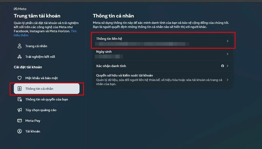 Bước 2: Nhấp vào Thông tin cá nhân > Thông tin liên hệ.