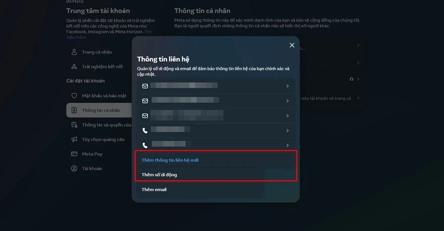 Sau đó, nhấp vào Thông tin cá nhân > Thông tin liên hệ > Thêm thông tin liên hệ mới > Thêm số di động để tiến hành thêm số điện thoại cho tài khoản.