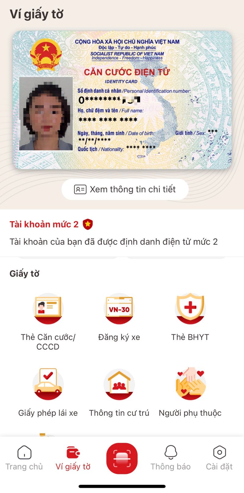 Đăng nhập ứng dụng VNeID, tại màn hình trang chủ tài khoản định danh điện tử mức 2 nhấn Ví giấy tờ