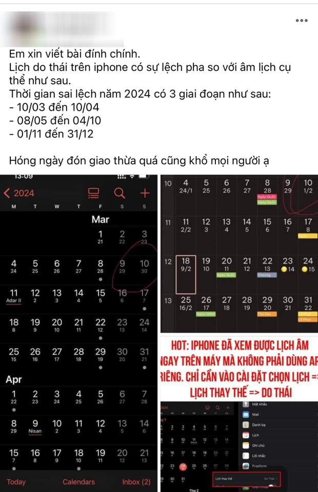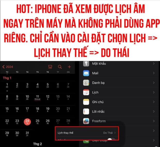 Cụ thể, trong ngày 24/1, nhiều người dùng chia sẻ nhau cách hiển thị lịch Âm bên dưới lịch Tây trong ứng dụng lịch của iPhone. Cách thực hiện rất dễ dàng, đó là chọn Lịch thay thế là Do Thái trong phần cài đặt. Thông tin này khiến nhiều người dùng iPhone thích thú và thực hiện theo nhưng thực tế lịch Do Thái có sự khác biệt với âm lịch mà chúng ta vẫn đang dùng.