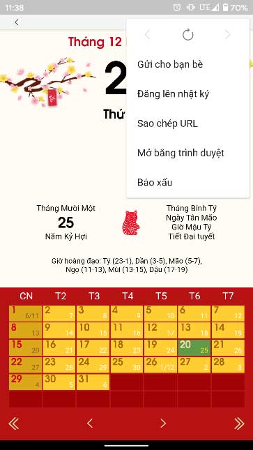 Nếu muốn xem thông tin chi tiết hơn, bạn chỉ cần mở thông báo từ trung tâm thông báo hoặc tin nhắn bên trong ứng dụng Zalo, sau đó chọn thẻ Lịch Âm. Ở màn hình kế tiếp, bạn sẽ thấy ngày âm lịch hiện tại cùng với các thông tin về bát tự, tiết khí, giờ hoàng đạo... ở phía dưới bên trái ngày dương lịch.
