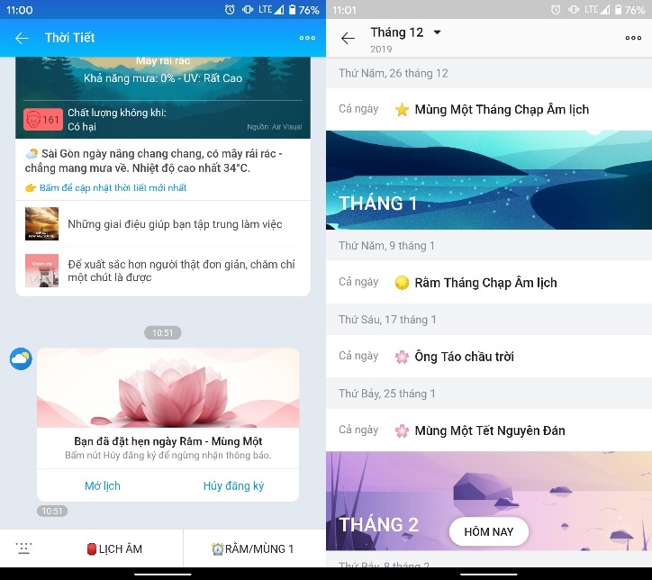 Ngoài ra, nếu bạn là người ăn chay nhưng lại thường xuyên quên ngày mùng 1 và ngày rằm, bạn có thể tạo thông báo nhắc nhở vào những ngày này ngay trên Zalo. Để thực hiện, bạn chỉ cần bấm lên nút Rằm/Mùng 1 bên trong tin nhắn Thời tiết. Nếu muốn biết trước ngày nào là ngày mùng 1 hoặc ngày rằm, bạn bấm nút Mở lịch để xem chi tiết. Nếu muốn ngừng nhận thông báo, bạn bấm nút Hủy đăng ký.