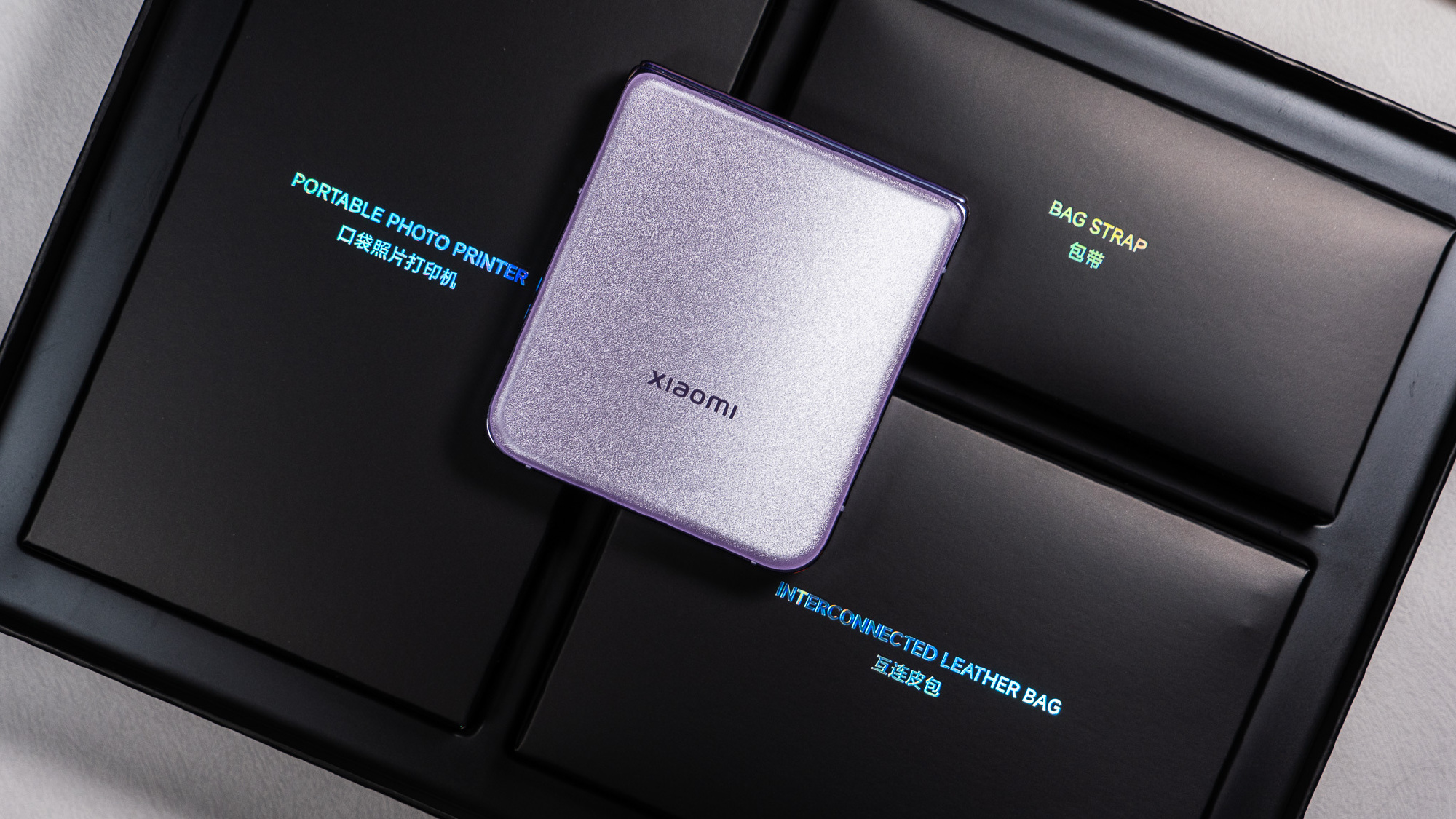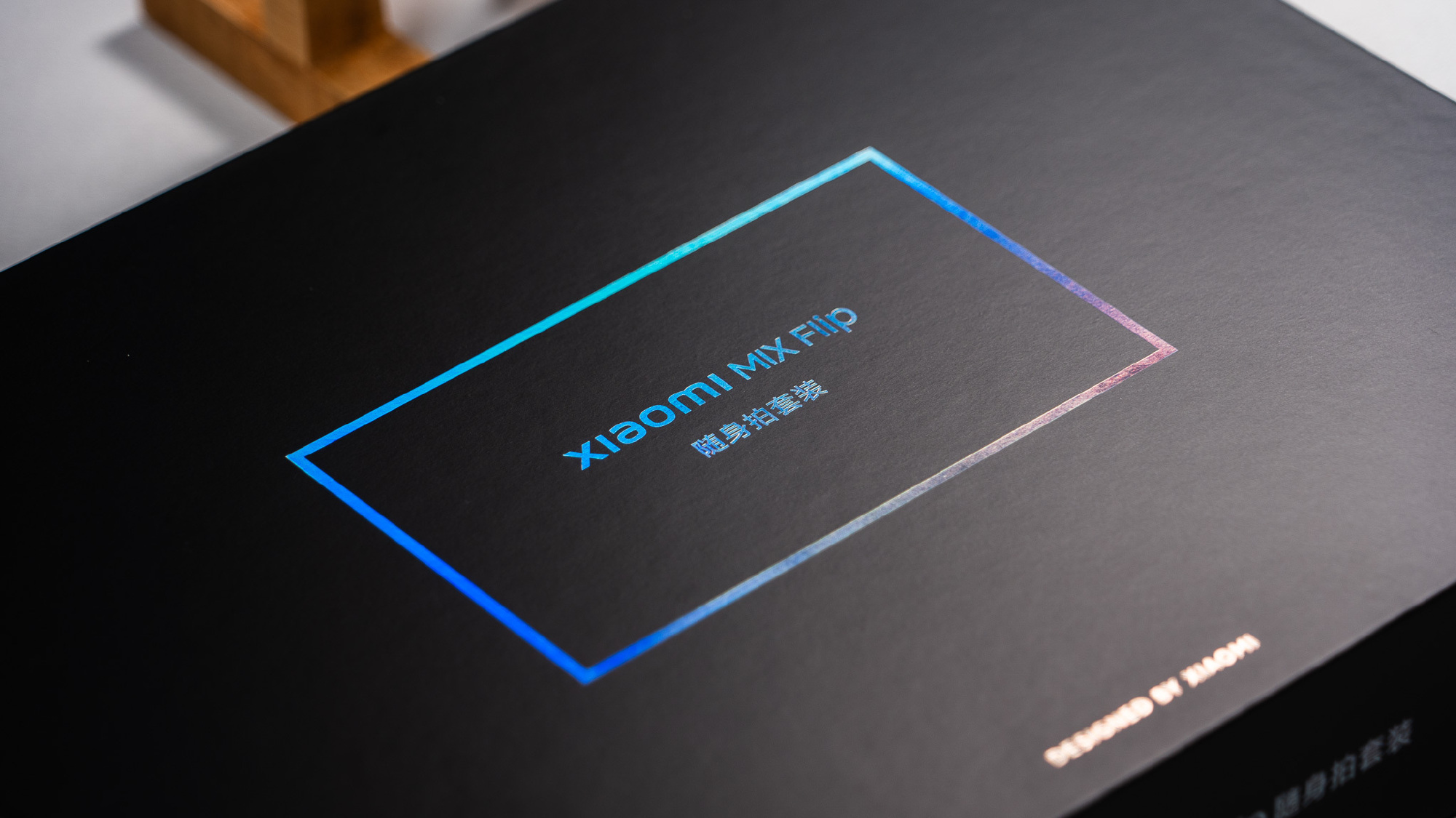 Hộp đựng của MIX Flip có thiết kế màu đen tuyền, mặt trước và hai bên in nổi logo Xiaomi MIX Flip màu vàng đồng, cùng với logo Leica và chữ "Xiaomi HyperOS". Trong hộp của MIX Flip, ngoài bộ sạc 67W, cáp dữ liệu và que chọc SIM, còn có một chiếc ốp lưng cứng màu tím giống với màu của điện thoại.