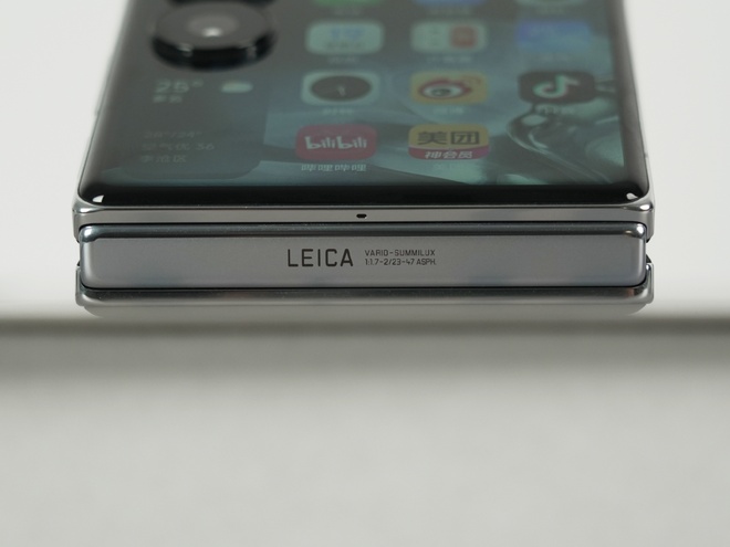 Trên bản lề của MIX Flip có in logo LEICA, chữ VARIO - SUMMILUX và thông số của hai ống kính phía sau. Đáng chú ý là có một lỗ mic thu âm rất nhỏ gần bản lề, kết hợp với loa thoại siêu nhỏ phía trên màn hình phụ, cho phép MIX Flip nhận cuộc gọi ngay cả khi gập lại.