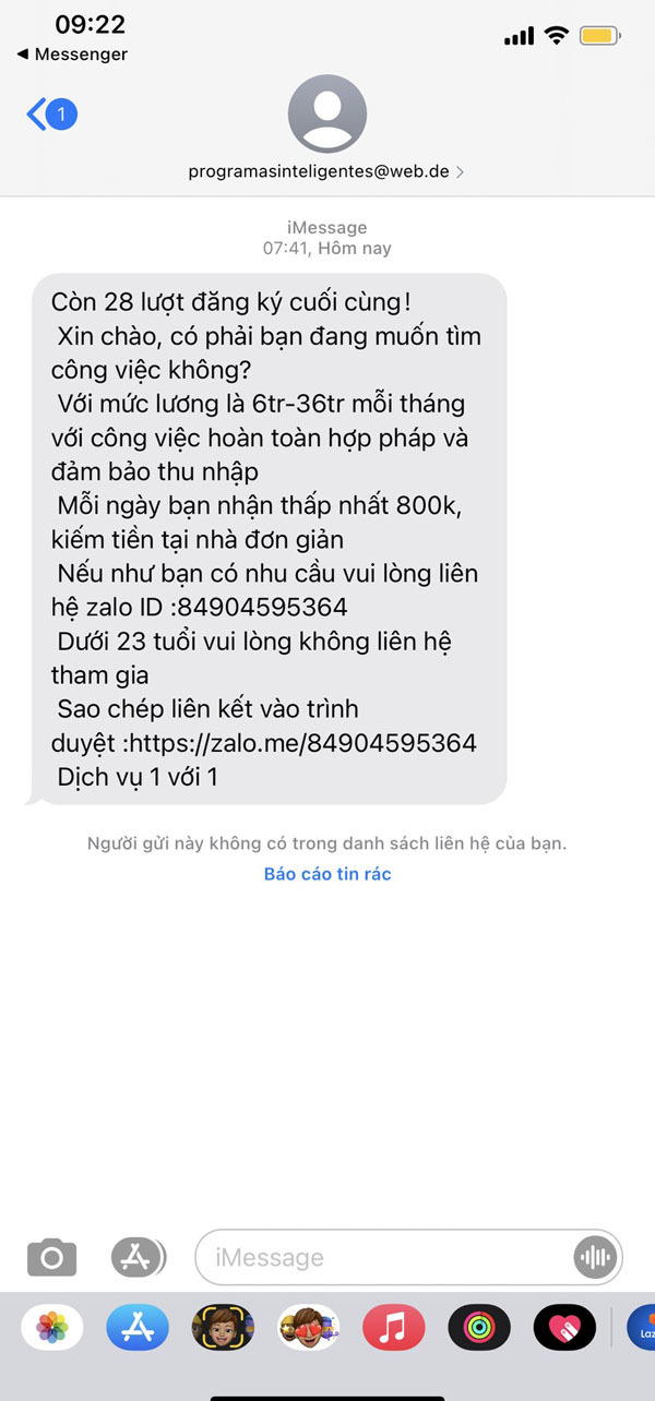 Trung tâm Ứng cứu khẩn cấp không gian mạng Việt Nam (VNCERT/CC) thuộc Cục An toàn thông tin, Bộ TT&TT vừa cho biết, qua theo dõi trên hệ thống tiếp nhận, phản ánh tin nhắn rác, cuộc gọi rác (qua đầu số 5656), cơ quan này đã ghi nhận nhiều phản ánh của người dân về việc nhận được tin nhắn spam trên iMessage có dấu hiệu lừa đảo về việc giới thiệu công việc đa cấp.