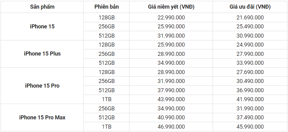 So với tháng 11/2023, đến nay, tất cả phiên bản của iPhone 15 series đều đã được điều chỉnh giảm từ vài trăm tới vài triệu.