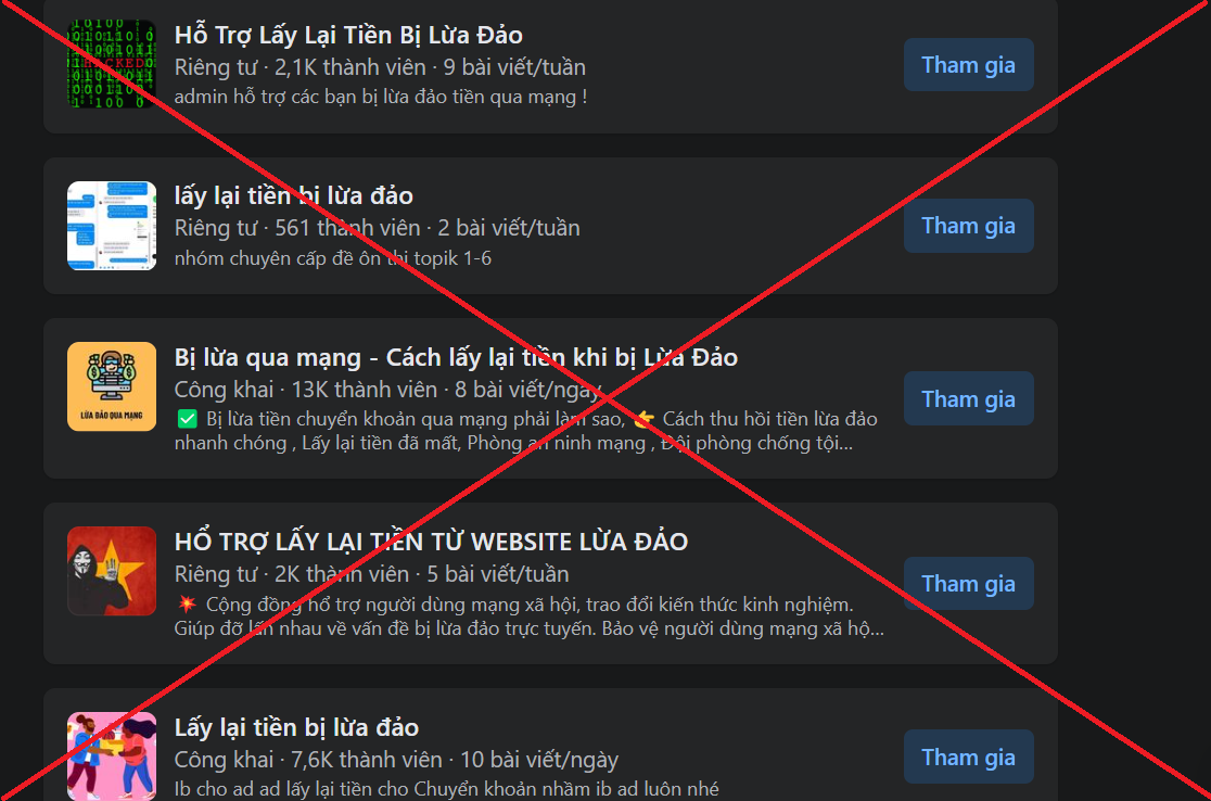 Thời gian gần đây, trên mạng xã hội Facebook xuất hiện nhan nhản các nhóm hỗ trợ lấy lại tiền lừa đảo. Chỉ cần gõ cụm từ “lấy lại tiền lừa đảo” trên thanh tìm kiếm của Facebook, sẽ xuất hiện hàng loạt nhóm công khai với tên gọi "Lấy lại tiền lừa đảo..." có hàng nghìn đến hàng chục nghìn thành viên.