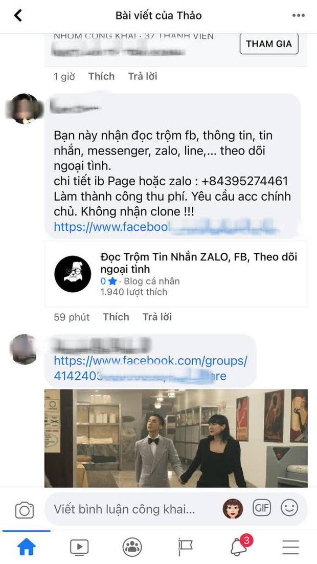 Dạo 1 vòng quanh Facebook, đặc biệt là các group anti Hải Tú, dễ tìm thấy các bình luận mồi chài chị em tham gia các dịch vụ đọc trộm tin nhắn Facebook, Zalo, LINE, Viber... và các ứng dụng nhắn tin khác, đồng thời theo dõi cả quá trình ngoại tình.