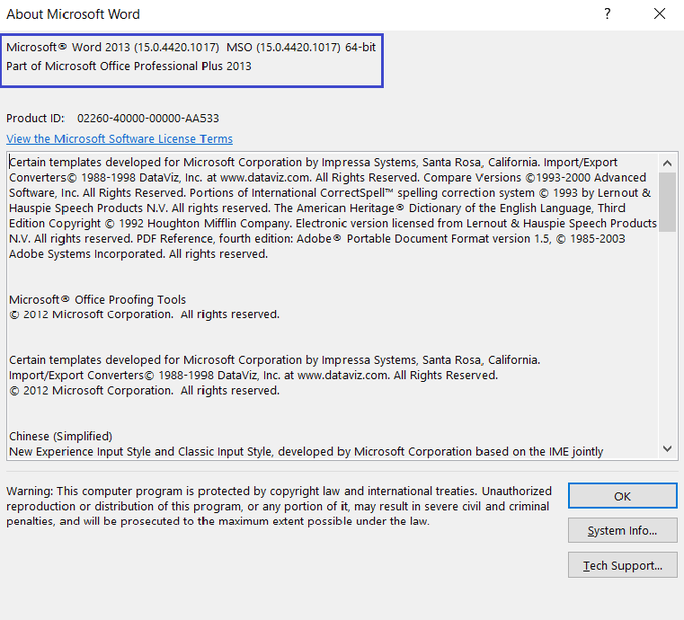 Bước 3: Kiểm tra thông tin phiên bản Microsoft Office đang sử dụng bằng cách mở bất kỳ ứng dụng Office nào, ví dụ Word hoặc Excel, chọn Tài khoản (hoặc Account) >> Giới thiệu về Word (hoặc About Word). Tại đây, thông tin phiên bản được hiển thị như hình bên dưới: