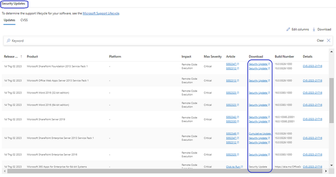 Bước 4: Tại trang web mở ra ở Bước 2, tìm đến phần Security Updates. Tại đây, chọn bản vá tương ứng với phiên bản Microsoft Office đã có ở bước 3 và tải về.