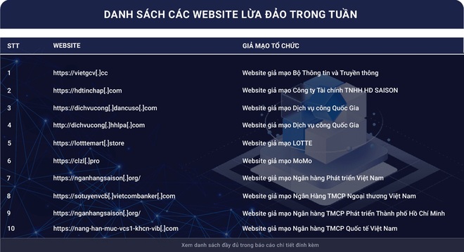 Theo thống kê, chỉ trong 3 tuần đầu tháng 4/2024, hệ thống canhbao.khonggianmang.vn của Cục An toàn thông tin đã tiếp nhận gần 630 phản ánh của người dùng về các trường hợp lừa đảo trực tuyến. Qua kiểm tra và phân tích, các chuyên gia của Cục An toàn thông tin nhận thấy có nhiều trường hợp lừa đảo giả mạo các cơ quan, tổ chức, doanh nghiệp, nhà cung cấp, dịch vụ lớn như một số bộ ngành, các mạng xã hội, ngân hàng, thư điện tử, dịch vụ công...