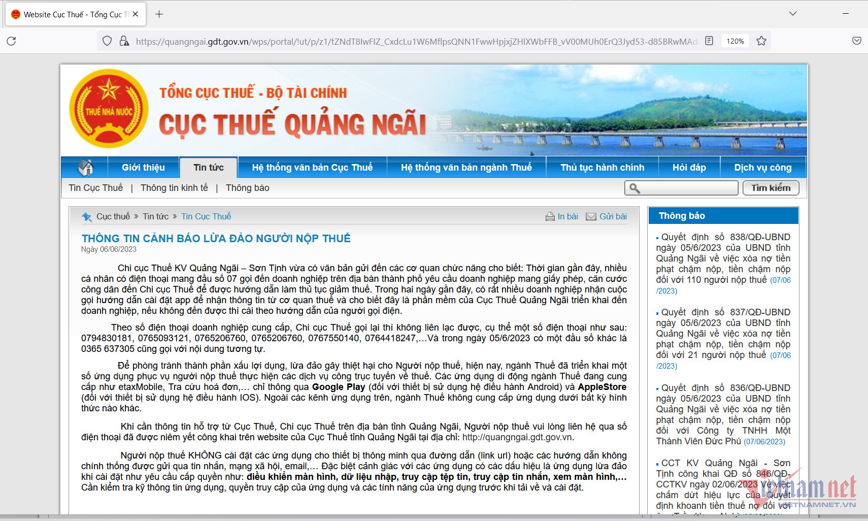 Thông tin cảnh báo được Cục thuế Quảng Ngãi đăng tải trên trang web chính thức của đơn vị này hôm 6/6.