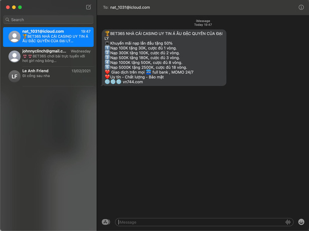 Những nội dung tin nhắn này giống hệt nhau, cùng tên nhà cái và đường link để tham gia, chúng có địa chỉ gửi đi là các email đăng ký iMessage. Dù đã thử rất nhiều cách như chặn các số điện thoại, địa chỉ web gửi tin nhắn đến, báo cáo spam... nhưng đều vô dụng, vì chỉ vài ngày sau các tin nhắn rác sẽ quay trở lại.