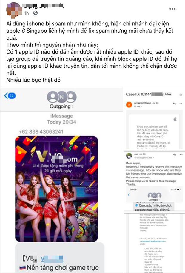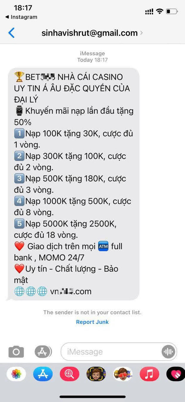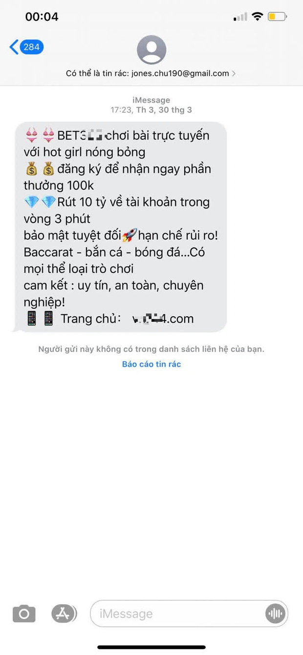 Theo đó, người dùng iMessage liên tục nhận được những tin nhắn rác quảng cáo các trang web đánh bạc, kèm theo những lời giới thiệu như chơi bài trực tuyến với hot girl nóng bỏng, đăng kí là nhận tiền ngay, rút 10 tỷ về tài khoản chỉ trong 3 phút, ưu đãi 50%...
