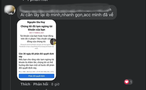 Tối ngày 18/8, Facebook Việt Nam xôn xao với thông tin hàng loạt tài khoản Facebook bị bay màu ngay trong đêm khiến nhiều người ngỡ ngàng. Theo đó, những người bị mất Facebook đã phản ánh, họ nhận được một thông báo với nội dung "Chúng tôi đã tạm ngừng tài khoản của bạn", lý do vì đã vi phạm Tiêu chuẩn cộng đồng trên nền tảng này, cùng với đó là nguy cơ khoá hẳn tài khoản rất cao. Các tài khoản này có quyền lên tiếng giải quyết trong vòng 30 ngày.