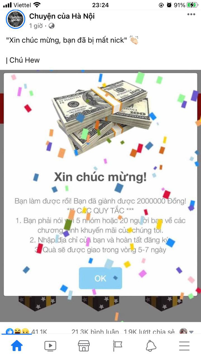 Rất nhiều fanpage, hội group lớn nhỏ trên Facebook đang đồng loạt lên tiếng về vấn đề này. Chiêu trò không mới nhưng dưới danh nghĩa giả một nhãn hàng lớn, nhiều người dùng Facebook đã chủ quan đánh mất tài khoản Facebook và thông tin cá nhân của mình.