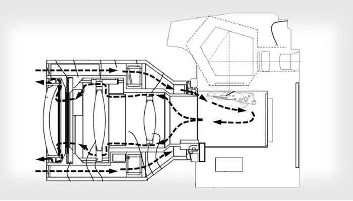Ống kính này hút không khí qua các kênh xung quanh viền ngoài của thiết bị. Không khí này được đưa trở lại hộp gương của máy ảnh khi gương được nâng lên và cảm biến được mở.