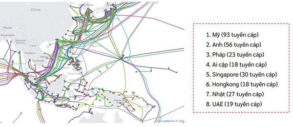 Tổng quan về hạ tầng cáp quang biển Việt Nam và các nước khác trong khu vực. Hiện Việt Nam có tổng cộng 7 tuyến cáp quang biển, 5 tuyến đang hoạt động và 2 tuyến sẽ đưa vào vận hành trong những năm tới đây.