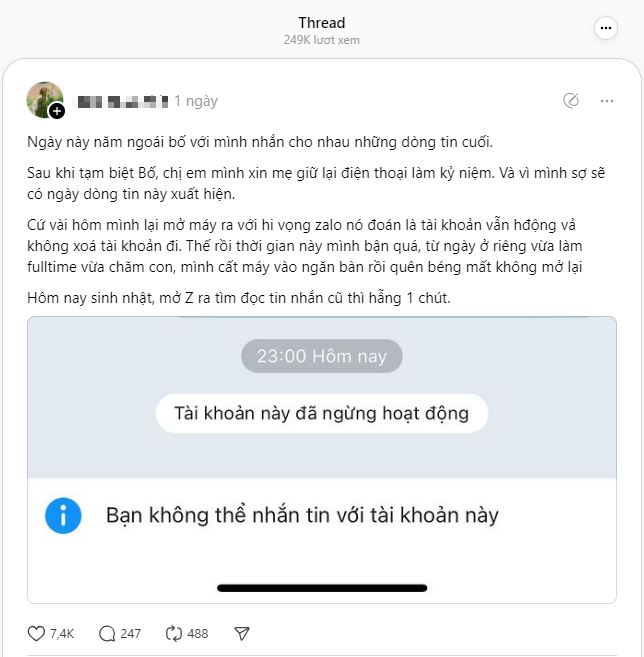 "Không rõ do mình không mở Zalo bố hay do tin nhắn cuối đã lâu quá rồi nên mới như vậy. Mình chỉ biết là giờ không còn chỗ để đọc lại những dòng tin có 1 trên đời như này nữa rồi".