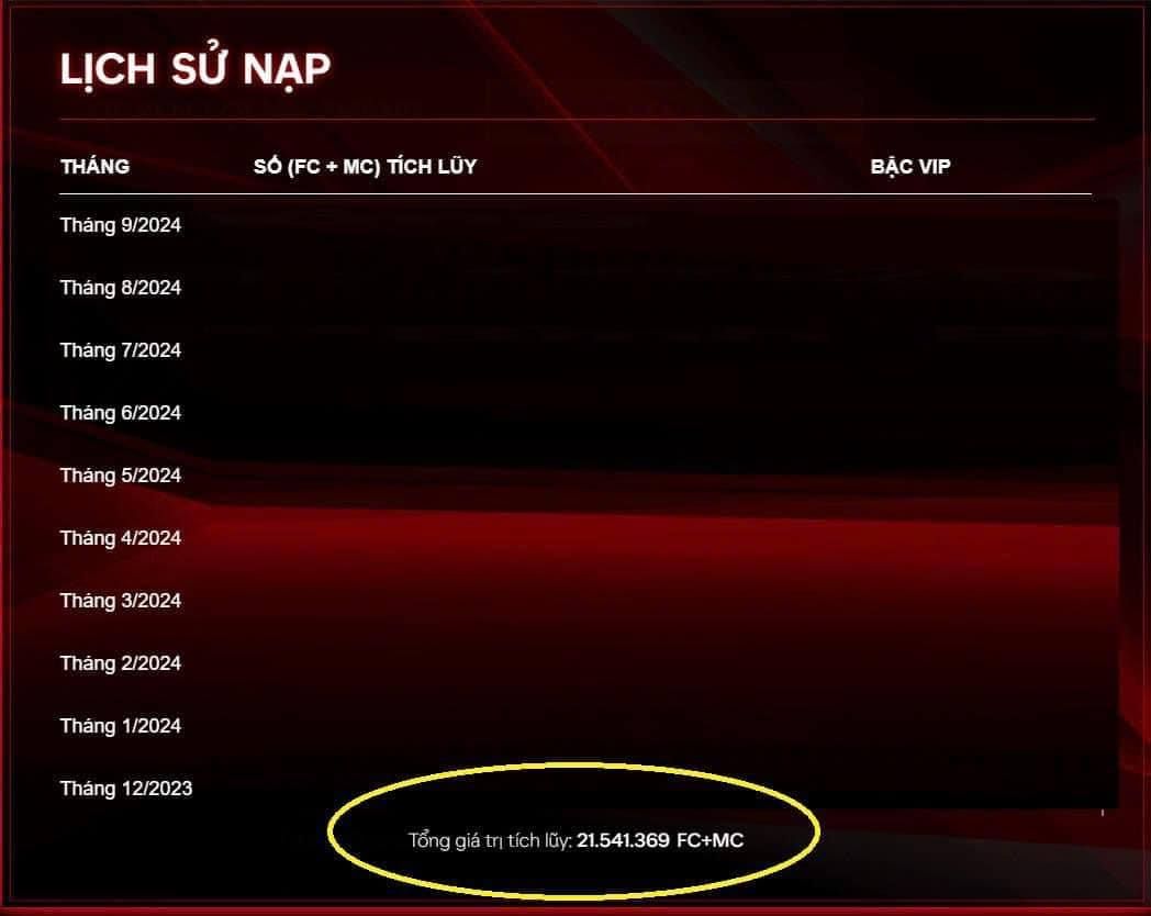 Mới đây, cộng đồng game tại Việt Nam nói chung và nhất là các game thủ FC Online nói riêng đã được một phen sửng sốt khi số tiền nạp game của một người chơi được hé lộ. Cụ thể, trong bảng thống kê từ tháng 12/2023 đến tháng 9/2024, người chơi này đã nạp vào tổng cộng 21.541.369 FC + MC (là những giá trị tiền tệ ảo trong FC Online). Con số được quy đổi ra tiền VND tương đương khoảng hơn 10 tỷ. Có thể nói, đây thực sự là một gia tài và số tiền 10 tỷ có thể một người lao động làm việc cả đời cũng chưa chắc đã có được.