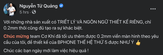 Cụ thể, CEO Nguyễn Tử Quảng chia sẻ trên trang cá nhân: “Với những nhà sản xuất có TRIẾT LÝ VÀ NGÔN NGỮ THIẾT KẾ RIÊNG, chỉ 0.2mm thôi cũng đủ tạo ra sự khác biệt. Chúc mừng team Cơ Khí đã tối ưu thêm được 0.2mm viền màn hình theo yêu cầu của tôi, để thiết kế của BPHONE THẾ HỆ THỨ 5 được NHƯ Ý”.