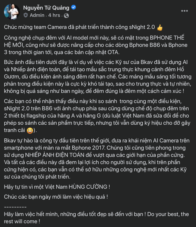 Theo ông Quảng chia sẻ, những kỹ sư của BKAV đã phát triển thành công công nghệ chụp ảnh đêm "sNight 2.0", sẽ xuất hiện trên Bphone B86 cũng như Bphone thế hệ mới. Để chứng minh tính hiệu quả của sNight 2.0, CEO BKAV đã đăng tải một bức ảnh chụp quang cảnh Hồ Hoàn Kiếm được chụp bằng Bphone B86, và so sánh nó với smartphone của "hãng A" và "hãng G". Có lẽ, không khó để chúng ta luận ra rằng "hãng A" là Apple iPhone, còn "hãng G" là Google Pixel.