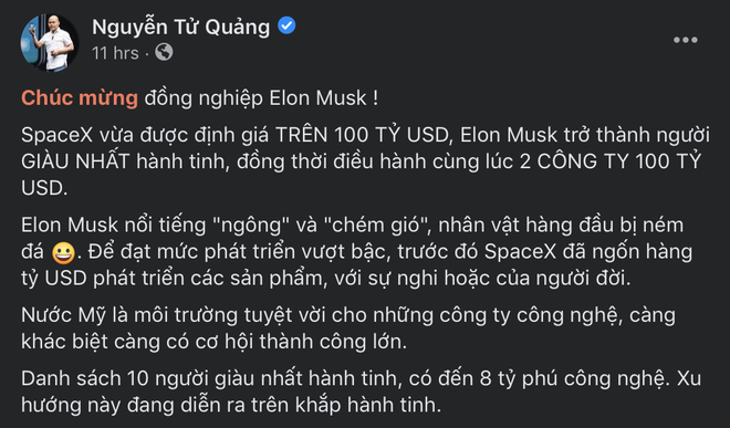 Trước thông tin này, ông Nguyễn Tử Quảng đã gửi lời chúc mừng tới Elon Musk và gọi CEO của Tesla và SpaceX là "đồng nghiệp". "Chúc mừng đồng nghiệp Elon Musk! SpaceX vừa được định giá TRÊN 100 TỶ USD, Elon Musk trở thành người GIÀU NHẤT hành tinh, đồng thời điều hành cùng lúc 2 CÔNG TY 100 TỶ USD", dòng trạng thái trên trang Facebook cá nhân của ông Quảng viết.