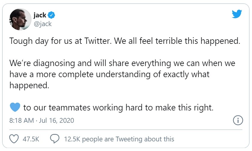 Trên tài khoản cá nhân, CEO Twitter Jack Dorsey xác nhận vụ tấn công và cho biết công ty đang đánh giá sự cố an ninh và nói rằng đây là "một ngày tồi tệ".