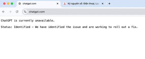 Theo đó, khi truy cập vào ChatGPT trên website, bạn sẽ nhận được thông báo “ChatGPT is currently unavailable” (ChatGPT hiện không khả dụng, chúng tôi đã xác định được sự cố và đang nỗ lực đưa ra bản sửa lỗi).