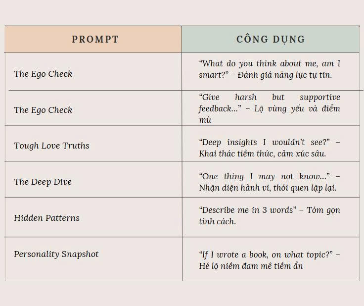Nếu bạn cảm thấy mơ hồ về hồ sơ ngầm mà ChatGPT đang lưu giữ về mình, có thể thử một trong sáu câu lệnh nâng cao prompt như sau: