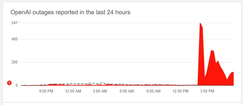 Ghi nhận của VietNamNet cho thấy, thực trạng này không chỉ xảy ra tại Việt Nam mà còn trên bình diện toàn cầu. Theo DownDetector, trang web này nhận được lượng lớn báo cáo sự cố liên quan đến OpenAI kể từ đầu giờ chiều 21/2.