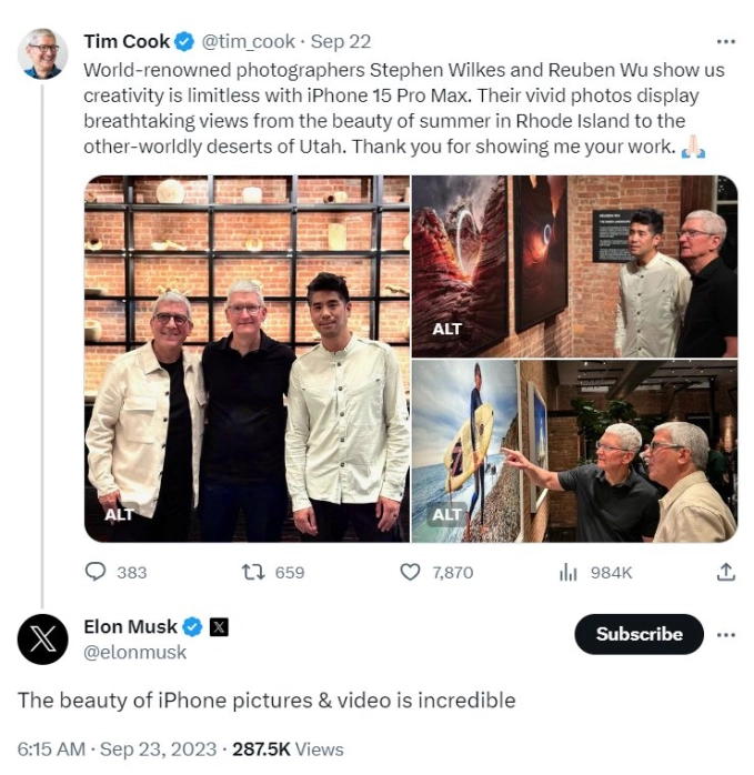 Thế nhưng mới đây, vị tỷ phú liên tục gửi những dòng bình luận khen ngợi iPhone 15 ngay trong bài đăng của CEO Tim Cook. Trong bức ảnh CEO Apple chụp chung với 2 nhiếp ảnh gia nổi tiếng là Stephen Wilkes và Reuben Wu, Elon Musk khen: "Vẻ đẹp của những bức ảnh và video của iPhone thật phi thường". Tiếp đó, vị tỷ phú khẳng định "Tôi sẽ mua một cái" ngay bên dưới bài đăng thông báo Apple chính thức mở bán iPhone 15.