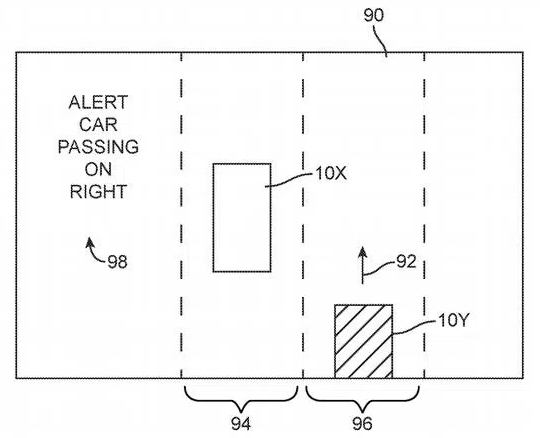 Minh họa của bằng sáng chế còn mô tả về các cảnh báo có thể sẽ được gửi cho tài xế, ví dụ "Ambulance Passing Pull Over Now" (Xe cấp cứu đang vượt, tránh đường ngay) và "Alert Car Passing On Right" (Cảnh báo có xe vượt phải).