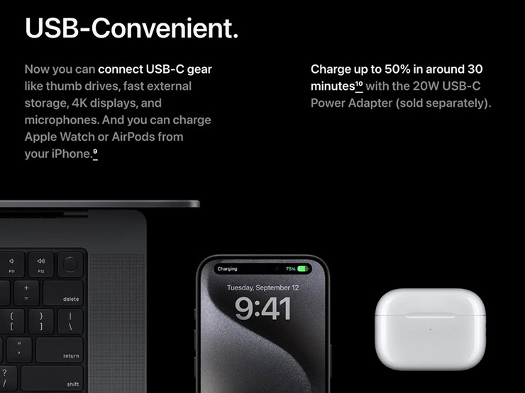 Apple thậm chí còn chỉ ra cách người dùng có thể kết nối cáp đó giữa iPhone 15 và AirPods Pro 2 bằng cách cắm cáp vào hộp tai nghe không dây và iPhone. Chưa rõ ý định của Apple là gì, nhưng nhiều người tin rằng có khả năng công ty giới thiệu tính năng sạc pin cho AirPods Pro 2 từ iPhone 15 thông qua cáp sạc USB-C.