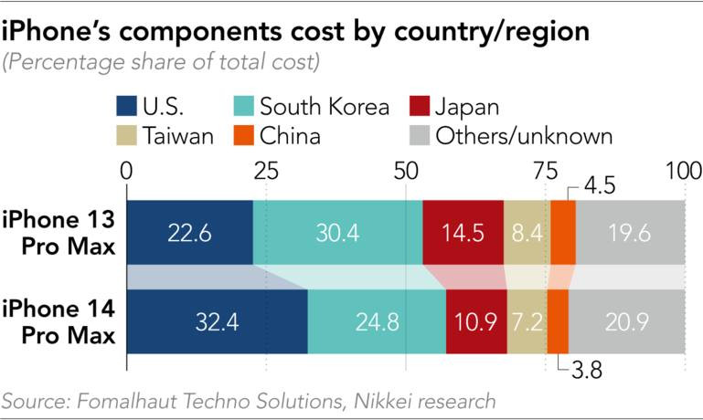 Theo Nikkei, linh kiện iPhone 14 phần lớn đến từ nhà cung ứng Mỹ, chiếm tỉ lệ 32,4%, tăng thêm 10% so với năm 2021. Hàn Quốc giảm 5% xuống 24,8%. Trung Quốc vẫn sản xuất phần lớn iPhone, song “táo khuyết” cũng dịch chuyển sang các khu vực khác như Ấn Độ, Đông Nam Á.