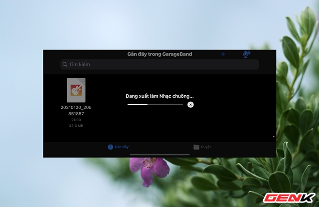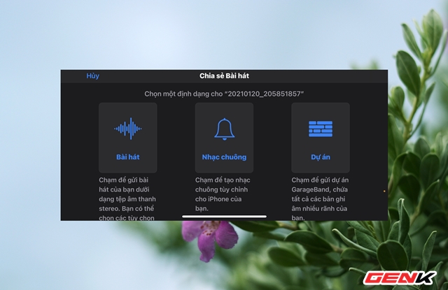 Ứng dụng Garage Band sẽ hiện ra và bạn sẽ trải qua vài bước khởi động ứng dụng, sau đó sẽ thấy bài nhạc nằm trong danh sách bài hát của Garage Band. Lúc này, bạn hãy nhấn giữ và chọn "Chia sẻ".