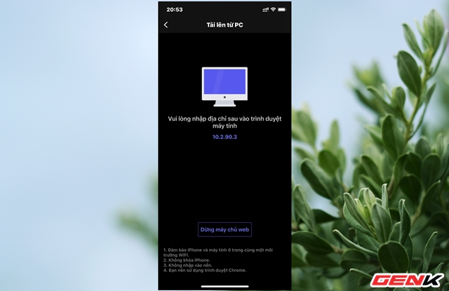 Ứng dụng sẽ khởi tạo một máy chủ web từ iPhone và cung cấp địa chỉ để bạn sử dụng máy tính kết nối và tải bài hát vào.