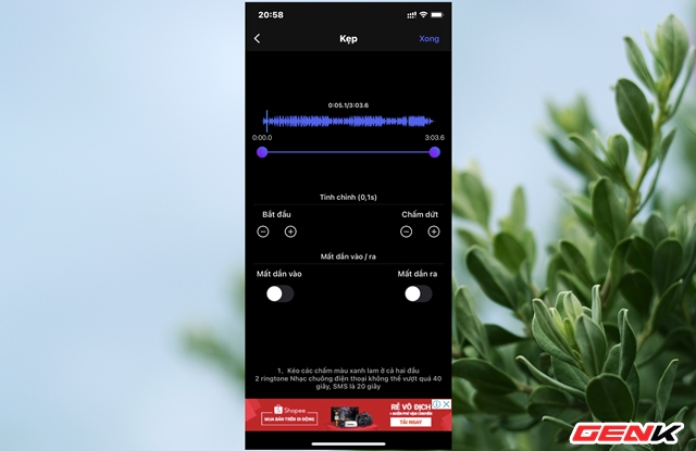 Lúc này, bạn hãy nhấn "Kep" để chuyển sang giao diện lựa chọn đoạn bài hát mình muốn sử dụng làm nhạc chuông. Tại đây bạn có thể điều chỉnh độ dài ngắn của đoạn âm thanh, tiếp theo là đoạn nhạc dạo đầu và mất đi theo cách to dần và nhỏ dần cho đỡ bị gắt gây ra cảm giác khó chịu. Sau khi bấm lưu bạn sẽ thấy được một tập tin mới trong danh sách và bạn hoàn toàn có thể đổi tên tập tin này cho dễ hiểu.
