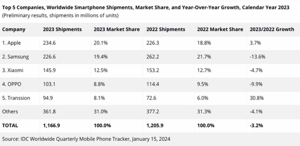Apple đã ghi nhận một kỷ lục về thị phần, với tỷ lệ lên đến 20,1% trong năm 2023, so với 19,4% của Samsung. Điều này đặc biệt nổi bật khi Apple là công ty duy nhất trong Top 4 nhà sản xuất smartphone lớn nhất toàn cầu có mức tăng trưởng tích cực hàng năm, từ 226,3 triệu đơn vị (năm 2022) lên 234,6 triệu đơn vị (năm 2023).