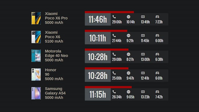 Dựa theo bài test của GSMArena, các kết quả cho thấy thời lượng pin của POCO X6 Pro có phần trội hơn một vài đối thủ cùng tầm khác.