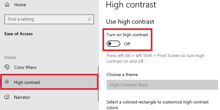Bước 3: Tiếp theo chọn mục High Contrast rồi ở dòng Turn on high contrast bạn gạt thanh ngang thành ON.