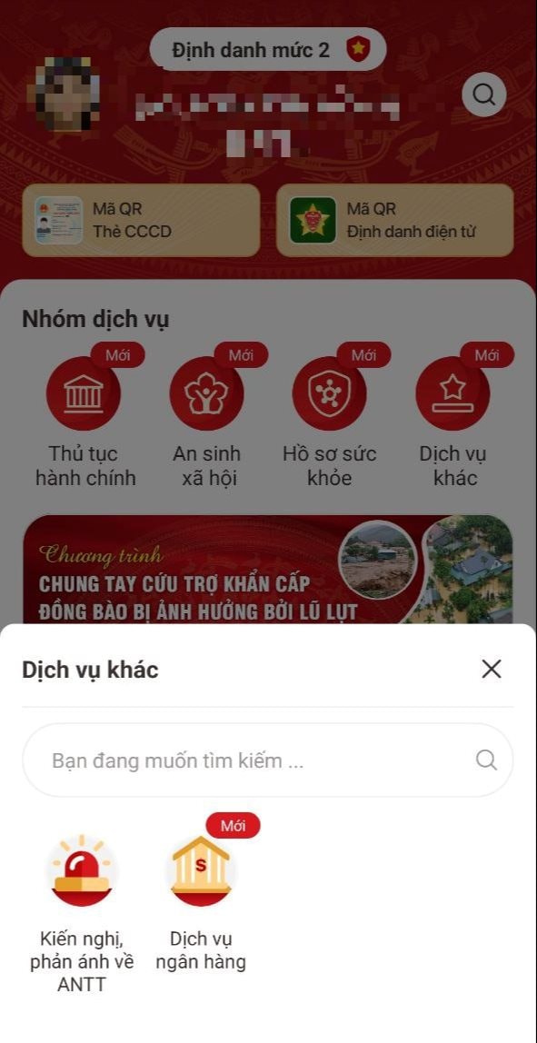 Cụ thể, khi vào VNeID, người dùng vào mục "Dịch vụ khác", sau đó chọn "Dịch vụ ngân hàng", sau đó chọn "Tài khoản thanh toán ngân hàng".