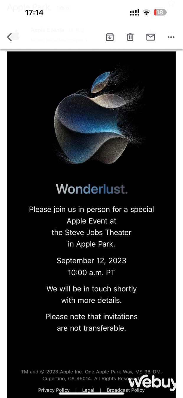 Mới đây, Apple đã gửi thư mời đến một số đơn vị truyền thông và trong đó có tôi được vinh dự tham dự sự kiện Wonderlust đáng mong chờ nhất trong năm. Dự kiến 10h đêm ngày 12/9 tại Apple Park (Cupertino, California, Mỹ), tức 0h ngày 13/9 theo giờ Việt Nam, khả năng cao iPhone mới sẽ chính thức được ra mắt.